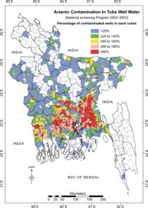 In Bangladesh, the contamination of the groundwater is known as the largest mass poisoning in history, caused by arsenic leaching into tube well water used for drinking and cooking. Before the 1970’s, residents used surface water for drinking and related activities, but this resulted in several types of diarrheal diseases because the water was contaminated with pathogens. To reduce this problem, the government installed tube wells, but many years later, it was discovered that the water from the tube wells contained arsenic in toxic levels. At this point, it was too late, and millions of people had already been exposed. An estimated 35 million people in Bangladesh have consumed arsenic contaminated drinking water for decades (Choudhury et al.). The health consequences of long-term exposure resulted in increased incidence of cancer, cardiovascular disease, and respiratory illness. Specifically, a 12 year long study found a link between arsenic exposure and skin cancers in Bangladesh, with Basal Cell Carcinoma and Squamous Cell Carcinoma being the most common forms. The results indicated a higher rate of these cancers among men because they were more likely to participate in outdoor labor and consume more water per day than others. In some areas of Bangladesh, such as Chandpur, Gopalganj, Madaripur, and Shariatpur, arsenic concentration in drinking water has exceeded 50 micrograms per liter, with levels even reaching as high as 500 micrograms per liter (Choudhury, et al.). It’s estimated that about 5.6% of deaths in Bangladesh are attributed to arsenic exposure, and arsenic related disease contributes to about 0.3% of the total burden of disease (Ahmad et al.). Arsenic exposure in Bangladesh is another example of how environmental health hazards can accumulate over time, causing a severe public health crisis. (AC)